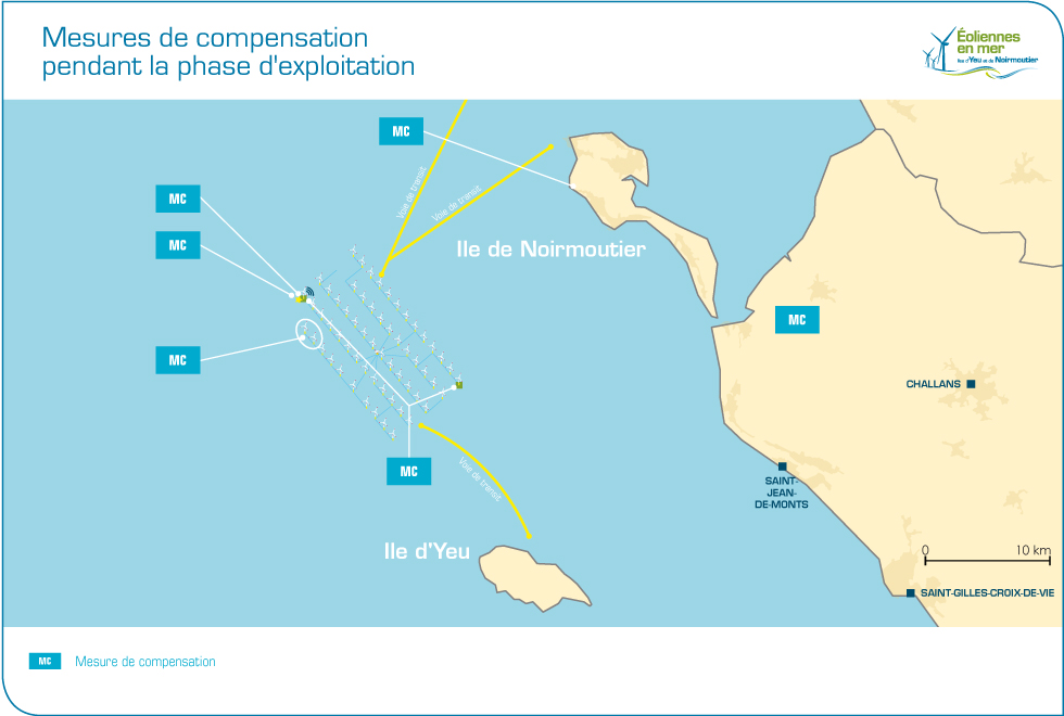 La société Éoliennes en Mer des Îles d’Yeu et de Noirmoutier mettra donc en place une mesure compensatoire afin de favoriser, par diverses actions (gestion de la fréquentation humaine, gestion des populations de prédateurs, surveillance et sensibilisation…) le succès reproducteur au sein des colonies nicheuses régionales.